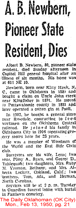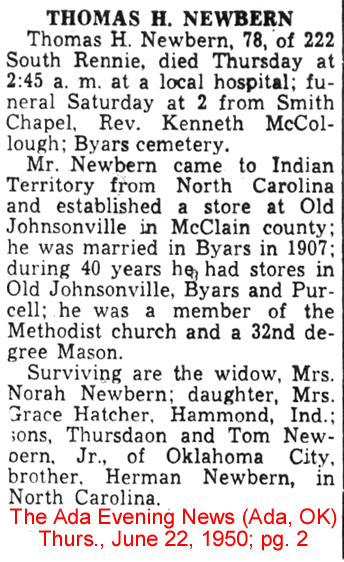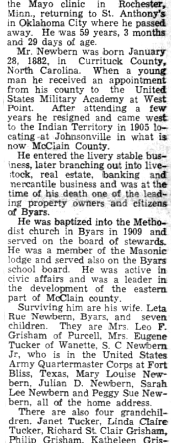 POWELLS POINT – Alton Wilson NEWBERN, 78, died at his residence on Oct. 26. Born in Currituck County, he was a farmer and owner/operator of Hilltop Market and a member of Hebron United Methodist Church. He was the husband of Margaret Owens NEWBERN of the home and son of the late Cleveland and Minnie Walker NEWBERN. Besides his wife, survivors include a son, Carlton Douglas NEWBERN of Powells Point; three sisters: Edna HUDGINS of Chesapeake, Va., Betty McINTOSH of Lakeland, Fla. and Ruth SCHULTZ of Sunlake, Arizona; and 2 grandchildren. A graveside service was held Monday in the family cemetery at Harbinger with the Rev. Dr. Kenneth C. SINGLEY officiating, assisted by the Rev. Linwood JONES. Twiford's Memorial Chapel in Elizabeth City is in charge. (The Coastland Times Tuesday, October 29, 1996)