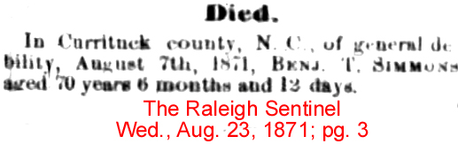CURRITUCK CO., N.C. - On Tuesday, the 7th inst. at Currituck Court House, about 5 o'clock, p.m., Martha, the daughter of B.T. SIMMONS, departed this life after an illness of five days. She had just returned from school with her mind richly stored with useful knowledge, and adorned with all the charms of "sweet sixteen". In her were cherished the hope and delight of a devoted & affectionate father and relatives. (The Old North State - Saturday, August 18, 1849)