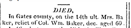 BAKER, Wm. (Mrs.) – (1812) June 17, 2012 / The following notice appeared in the March 6, 1812 issue of the Raleigh Register newspaper.