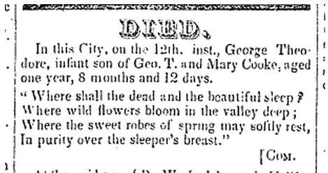 The following death notice appeared in the June 18, 1851 issue of the Raleigh Register for 1 year old, George Theodore COOKE. He was the son of  Geo. T & Mary COOKE.