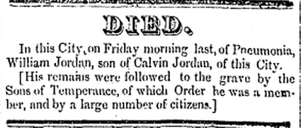 The following death notice for William JORDAN, son of Calvin JORDAN, appeared in the April 16, 1851 issue of the Raleigh Register.