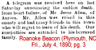 AURORA - Mrs. Rosa Flowers Austin, 84, of Route 2, widow of Jesse Howard Austin, Sr., died Tuesday in a Beaufort County nursing home after a brief illness. A native of Beaufort County, she was a daughter of Mr. and Mrs. John Flowers. She was a member of Campbells Creek Methodist Church. Surviving are three daughters: Mrs. H.A. Hilderbrand of Fairburn, Ga., Mrs. Tom Rose of Wilson, and Mrs. David Hagan of Rockville, Md.; a son, J.H. Austin, II of Route 2, Aurora; a half-sister, Mrs. Irvin Mayo of Washington; a brother, George Flowers of Merritt; 11 grandchildren; and 14 great-grandchildren. A funeral service will be held today at 2:30 p.m. in Campbells [rest of obit is missing]. (Unknown newspaper - October 1965) NOTE: According to a NC death certificate, Rosa was born in Beaufort Co. on March 13, 1881 and died in Washington, Beaufort Co., NC on October 5, 1965.
