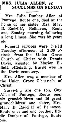 Mrs. Alma Kathryn Adams Allen, age 83, a resident of 6742 NC Hwy. 99 N. Pantego, died Thursday, October 29, 2009. Graveside services will be 2:00PM Sunday, November 1, 2009 at Davis Cemetery and will be conducted by Linwood Adams. Bob Adams, Wade Allen, Jerry Giles, James Paul Allen, Junior Joyner and Marvin Smith will serve as pallbearers. Mrs. Allen was born in Lenoir County February 9, 1926 to the late Joseph Jeremiah Adams and Carrie Eliza Long Adams. She was a graduate of Pantego High School and was a member of Union Grove Church of Christ. On July 8, 1947 she married Harold Cleveland Allen who preceded her in death on February 13, 2004. Survivors include her daughter; Polly Adams and husband Ricky of Belhaven, two sons: Jerry Allen of the home and Clayton Allen and wife Terry of Raleigh, three grandchildren: Justin Adams, Rebecca Adams, Tammy Perry and one sister: Verldine Davis of Greenville. She was preceded in death by one sister: Margie Paul. Paul Funeral Home of Belhaven is honored to serve the Allen family. (Paul Funeral Home)