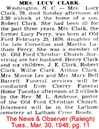 CHOCOWINITY - Mrs. Kathleen Carrow (Mammy) Cox , 80, died Tuesday, October 28, 1997. Arrangements are by Paul Funeral Home, Washington. (The Charlotte Observer (Charlotte, NC) – October 30, 1997; pg. C5)