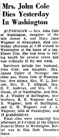 Mrs. Ethel Baker Chauncey, 92, of 109 Jackson St., Washington, died Saturday, Feb. 7, 2009, at home. A graveside service will be conducted today at 11 a.m. in Oakdale Cemetery with Chaplain Sanford Sears officiating. Mrs. Chauncey was born in Beaufort County on Aug. 17, 1916. She was the daughter of the late Wiley and Janie O’Mary. On Jan. 20, 1934, she married Samuel H. Chauncey, who preceded her in death on Dec. 26, 1972. Survivors include one daughter, Joyce Seavey of the home; five grandchildren; nine great-grandchildren and three great-great-grandchildren. She was preceded in death by five brothers, Bill Baker, James Baker, Jack Baker, Swindell Baker and Jesse Baker; three sisters, Mamie Chauncey, Gladys Anderson and Bertha Jackson; one grandson, Sam Smith and one great-grandson, Nickolas Stokesberry. Arrangements are by Paul Funeral Home, Washington. (Washington Daily News [Washington, NC] – Tuesday, February 10, 2009)