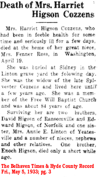 BELHAVEN - Ione Bishop Cox, 91, of Belhaven and more recently a resident of Cross Creek Health Care Center, Swan Quarter, died Monday, July 10 at Cross Creek. Mrs. Cox was born in Hyde County, the daughter of the late Charlie R. and Lela Mae Jones Bishop. She worked for many years at Mrs. Padgett's store and The Grill in Pantego. She was the widow of Herman G. Cox who died in 1973. Several cousins survive. Funeral services were at the graveside in Soule Cemetery Wednesday with Steve Bryan officiating. (The Coastland Times (Manteo, NC) - Thursday, July 13, 1995; pg. 6A)