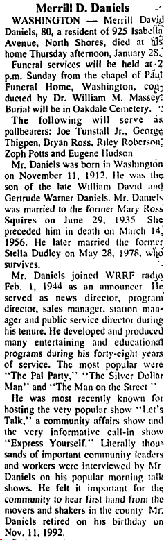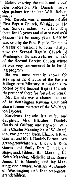 CHOCOWINITY -Richard Henry "RH" Daniels, 77, died Sunday, Feb. 27, 2011, at Willow Manor Nursing Home. He was born on July 7, 1933 in Vanceboro. He grew up in Chocowinity and attended Beaufort County Schools. He is a 1953 graduate of P.S. Jones High School. He was a member of Warren Chapel F.W.B. Church. His funeral will be held at 2 p.m. Friday, March 4, 2011, in the chapel of Randolph Funeral Home in Washington, N.C. with Kenneth Simmons, pastor, officiating. Burial will follow in Whitfield and Whitley Cemetery. He is survived by his sister, Alice Gay and one brother, Fred "Dollye" Daniels, both of Vanceboro. Arrangements are by Randolph Funeral Home, Washington, N.C. (Sun Journal [New Bern, NC] - Monday, March 7, 2011)Thelma Louise Stowe Daniels