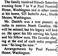 Mr. William Harold “Bud” Daniels, native son of North Carolina, passed away from this life on June 2, 2008 in Phoenix, Arizona. Bud was born in Bath, North Carolina in 1932. He was the son of the late Millard Blount Daniels and Audrey Browne Woolard Daniels. Bud lived in the Douglas Crossroads community as a young man. He graduated from Bath High School in 1952 and attended Roanoke Bible College in Elizabeth City. Bud served in the ministry for several years before moving to Phoenix in 1954 for health reasons. He received both a BS and a Master’s Degree from Southwest Christian Seminary. Bud also attended Arizona State University. He met and married June West and shared 48 years of marriage, having one son, James. Bud taught elementary school in Phoenix for 13 years and was a small business owner. Throughout his 54 years in Phoenix, Bud maintained strong ties to the Washington area. Survivors include his wife, June; his son, James and his wife, Rebecca; four wonderful grandchildren he both loved and adored (they were the light of his life) Shelby, Emma, Liberty and Ronin; his sister, Christine Hardison and her husband, John of Sidney Crossroads, his aunts, Bonnie Boyd, Margie Keel and her husband, Clayton all of Washington; many cousins; his mother-in-law, Samantha West of Phoenix; and brother-in-law, Ray West and his wife, Kathy of Phoebe, MS. The family will receive friends from 6:00 pm to 8:00 pm Monday, June 9, 2008 at Paul Funeral Home, Washington. A graveside service will be held 11:00 am Tuesday, June 10, 2008 at Oakdale Cemetery, Washington. Bud held a special love for Roanoke Bible College. Paul Funeral Home of Washington is serving the Daniels family. (Washington Daily News [Washington, NC] – Monday, June 9, 2008)