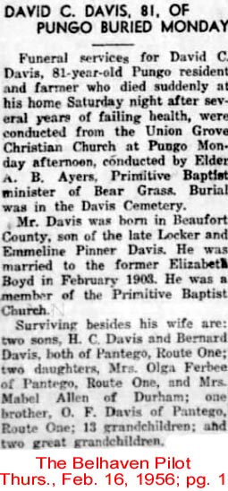 Mr. Albert “Ray” Davenport, age 58, a resident of 265 South Wharton Station Road of Washington, died Saturday, April 29 2006 at his home after an extended illness. Funeral services will be held at 2:00 p.m. Monday, May 1, 2006 from the Chapel of Paul Funeral Home, Washington, conducted by the Rev. Dianne B. Catlett. Burial will follow in Pamlico Memorial Gardens. The following will serve as pallbearers: Robert Diggs, Billy Davenport, Jr., Steve Davenport, Michael Davenport, J.D. Davenport and Bruce Nobles. Mr. Davenport was born in Beaufort County on December 26, 1947. He was the son of the late Johnny Richard Davenport, Sr. and Birdie Elizabeth Garris Davenport. Mr. Davenport worked at Abrams Restaurant, Fifth Street Shell and Holiday Inn. He was a member of Wharton Trinity United Methodist Church. On September 14, 1975, Mr. Davenport married the former Elsie Faye Boyd, who survives. Surviving with his wife are two brothers, Billy Davenport and James Henry Davenport both of Washington; and three sisters, Frances Nobles of Washington Park, Glenda Ingalls and Doris Dellinger both of Washington. Mr. Davenport was preceded in death by a brother, Johnny Richard Davenport, Jr. The family will receive friends from 7:00 p.m. to 9:00 p.m. Sunday, April 30, 2006 at Paul Funeral Home, Washington and other times at the home, 265 South Wharton Station Road, Washington. Paul Funeral Home of Washington is serving the Davenport family. (Washington Daily News (Washington, NC) – Sunday, April 30, 2006)