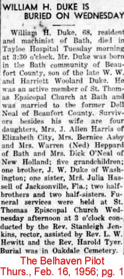 As the sun was setting on March 16, 2008, Edith Inez Jefferson Duke, age 69, of Washington, NC passed away with her family by her side. A funeral service will be held 2:00 PM Wednesday, March 19, 2008 at the Chapel of Paul Funeral Home in Washington officiated by Rev. Barbara Chaffee. Burial will follow in Oakdale Cemetery. Troy Phelps, J. R. Collins, Jim Jefferson, Swindell Braddy, Larry Lang and Earl Braddy will serve as pallbearers. Mrs. Duke was born in Beaufort County on May 28, 1938 daughter of the late Grady Jefferson and the late Evelyn Braddy Jefferson. She was a 1956 graduate of Chocowinity High School. Mrs. Duke married Golden Odell Duke in September of 1956 who preceded her in death on November 23, 1983. She was the original owner of E-Dell’s Beauty Shop. She also worked at WITN-TV and managed various retail stores including Catherine’s and the Betsy Ross Store. She was most recently employed as a teller with Cooperative Bank. Mrs. Duke was a member of the Zion Episcopal Church and a past member of the Washington Singles Club. Survivors include her daughter, Tammy Duke Lee and her husband Leo of Grimesland and her two grandchildren, Brittany Golden Apple and Brentley Speight Lee; her nephew, Jim Jefferson and his wife Becky and two very special friends, Mary Noe and Judith Collins. She was preceded in death by her brothers, Loris “Jeff” Taylor Jefferson and James “J. T.” Thadeus Jefferson. The family will receive friends from 6:30-8:00 PM Tuesday, March 18, 2008 at Paul Funeral Home and other times at the home of Tammy and Leo Lee, 259 Farmington Road, Grimesland. Paul Funeral Home of Washington is serving the Duke family. (Washington Daily News [Washington, NC] – Tuesday, March 18, 2008)