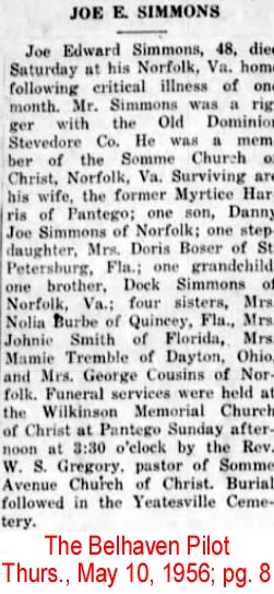 Ellen Louise Williams Simmons, age 87, a resident of Bath, NC, died Thursday April 20, 2017 at her home. Funeral services will be held 2:00 PM Sunday April 23, 2017 at St. Clair’s Church of Christ, Hwy. 99 South, Bath, and will be officiated by Craig Hagan. Burial will follow in Belhaven Community Cemetery. Bob Morlock, Jr., Charles William Brown, Jr., Jeremy Foreman and Dick Plattenberg will serve as pallbearers. Mrs. Simmons was born in Pitt County on December 3, 1929 to the late Alonza Dawson and Rosa Cornelius Williams. She retired from the garment industry after many years. She was a member of St. Clair’s Church of Christ. Mrs. Simmons was married to Lloyd Dean Simmons who preceded her in death on October 28, 2016. Survivors include a daughter-in-law, Deborah W. Morlock and her family, nieces and nephews and many friends. In addition to her husband she is preceded in death by a son, Jerry Lee Jones. The family will receive friends from 1:00 PM until the funeral hour on Sunday April 23, 2017 at St. Clair’s Church of Christ. Paul Funeral Home of Belhaven is honored to serve the Simmons family. (Paul Funeral Home)Joe Edward Simmons