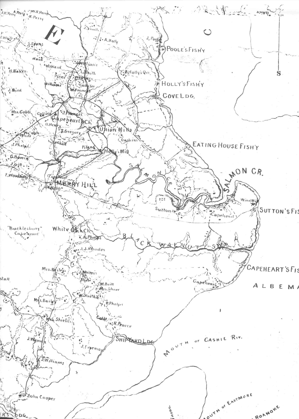 SHIPYARD LANDING on the map is located at approximately the corner of Rt. 308 (Cooper Hill Road and Rt. 45). Continuing up Rt. 45 is the land of who I believe to be Richardson Pearce. I am not positive which Cobb family was living next to Pearce but based on the 1860 census it was probably Thomas Cobb.