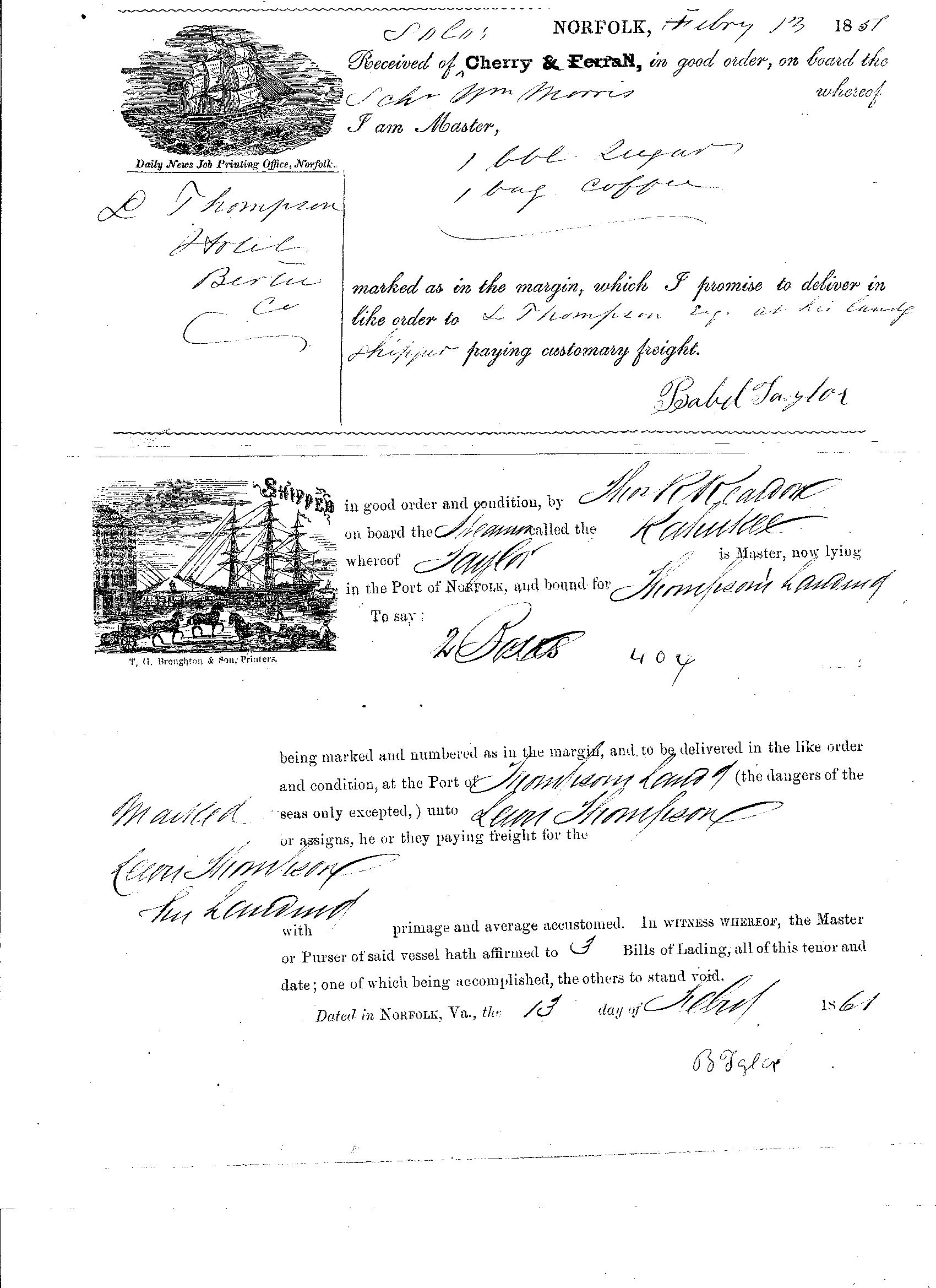 These Bills of Lading were for delivered from Norfolk, Va. to "Thompson's Landing" on the Roanoke River, just down the current Weeping Mary Road in Hotel (now Lewiston-Woodville). Lewis Thompson (1808-1867), the ancestor of most families raised here, was a NC senator, planter, businessman, and graduate and trustee of the University of North Carolina.