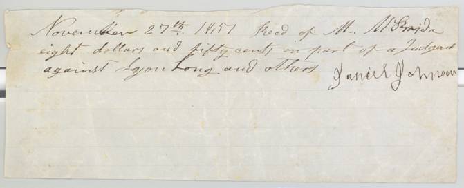 November 27th 1857 – Received of M. McBride eight dollars and fifty cents in part of a judgment against Lyon Long and others.