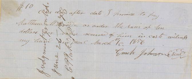 One day after date I promise to pay Matthew McBride on order the sum of ten dollars for value received of him in cash witness my hand and seal March 1st 1856.
