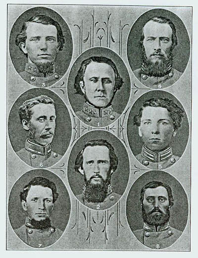 Our position at Carter's on the east bank of the Watauga river, was impregnable, and the enemy, after two assaults, flanked us at Devault's Ford on the north, and Taylor's on the south side, causing us to fall back to Zollicoffer, or "Union Depot," now Bluff City. The enemy about this time hearing about our great victory over them at Chickamauga, hastily retired towards Knoxville. We followed them to Bull's Gap, the Sixty-ninth being the only infantry regiment. On 5 October, 1863, the cavalry had a fight at Greenville, killing seven, wounding twelve and capturing ten of the enemy, with a loss of three killed and seven wounded, General Jno. S. Williams, of "Cerro Gordo" fame, commanding our troops. On 15 October, after several days skirmishing with the enemy, General Williams gave battle at Blue Springs with his 1,800 dismounted men, holding in check Burnside's 7,000 veterans. The Sixty-ninth was ordered to his aid, but hearing of a flank movement of the enemy, we were ordered to retreat towards Jonesboro, and finally to Abingdon, Va. In our retreat three miles above Greenville, our cattle, wagons, artillery and infantry, in order named, were surrounded before we knew it. General Burnside had thrown General Foster with 3,000 cavalry in our front, attempting our capture. The first information we had of their presence was in the capture of our Adjutant, L. C. May, and Captain Tip (H. H.) Taylor, Acting Adjutant-General of our brigade. Captain May escaped and gave us warning.