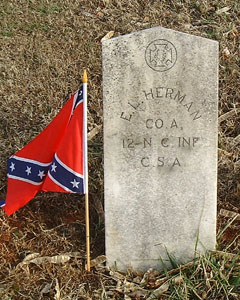 56. Elkanah "Cain or Cany" L. HERMAN was born between September 1828 and 1832 in Lincoln (Catawba County), North Carolina.51,52,187,189,195,196 His record in the War Between the States is as follows:197 HERMAN, E. L., Private, Company A, 12th Regiment, NC Troops - Enlisted in Catawba County on April 1, 1862. Present or accounted for until discharged on January 27, 1863. Reason discharged not reported, North Carolina pension records indicate he was wounded near Richmond, Virginia, in July, 1862. He died before 1911 at the age of 83 in Catawba County, North Carolina. He was buried in Conover City Cemetery, Conover, Catawba, North Carolina. Elkanah served in the military in Civil War, as Private, Co A, 12th Regiment, NC Troops. He enlisted in Catawba Co on 1 Apr 1862, was present or accounted for until discharged on 27 Jan 1863. Reason for discharge was reported; NC pension records indicate he was wounded near Richmond VA in Jul 1862. Elkanah "Cain or Cany" L. HERMAN and Mahala SETZER were married on 11 December 1851 in Catawba County, North Carolina.198 Reuben Deal, bondsman Mahala SETZER, daughter of John SETZER and Maria "Mary" (May) [Weidner] WHITENER, was born between 1832 and 1835 in Lincoln (Catawba County), North Carolina.52,53,199 She died before June 1880 at the age of 48.187 Elkanah "Cain or Cany" L. HERMAN and Mahala SETZER had the following children: 284 | i. | Mary L "Tobitha" HERMAN was born on 3 May 1852 in Catawba County, North Carolina.52,53,187,189,200 She died on 19 March 1922 at the age of 69 in Catawba County, North Carolina.200 She was buried in Conover City Cemetery, Conover, Catawba, North Carolina. | 285 | ii. | Frances "Fanny" HERMAN was born about 1854 in North Carolina.52,53 | +286 | iii. | Florence Virginia "Jennie" HERMAN. | +287 | iv. | Candace Elizabeth HERMAN. | +288 | v. | John Franklin HERMAN. | +289 | vi. | William Thomas HERMAN. |
