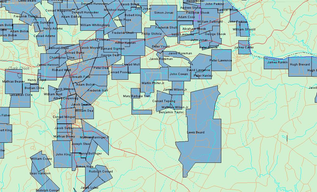 At the top right corner of the image, go due west to Henry Miller, then go South to Adam Cook whose first land grant was on Lyles Creek near the Catawba River and just north of current I-40. Simon Jonas is on the West. Isaac Lawrence is on the South. Frederick Shook is on the East. Andrew Shook is on the North. Conover is at the intersection of US-70 and US (business)-321 in the grant of Gilbreath Falls. Newton is just south of there in the grants of Adam Bolick, Albert Corpening, Jacob Deal, Frederick Gaff, Conrad Mingus and William Deal. The land grant of Sebastian Cline is due west of Newton. St. Paul's Lutheran Church is just west of Newton on the head waters of Clarks Creek. The grant is Bostian Cline which has Sebastian Cline on the west and Henry Propst on the north. St. John's Lutheran Church is where the main road north from Conover towards Oxford Dam (Lake Hickory) crosses Lyles Creek. The church land was bought from Henry Pope (Heinrich Papst). The land grant is the Henry Pope grant which is surrounded by William Whitingbert, Melchor Hefner, Jacob Bolick, Robert King and Frederick Shull.