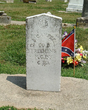CAMPBELL, D. A., Served in Lt. Gen. Theophilus Hunter Holmes Regiment, Company B, Freeman's North Carolina Infantry Battalion. This unit served both as the Salisbury Prison Guard Battalion and as Capt. Henry P. Allen's Company, North Carolina Local Defense Troops at Fort Fisher, NC. [NARA]