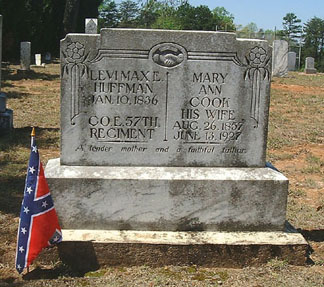 HUFFMAN, LEVI MAXWELL E., Private, 57th Regiment, Company E, NC Troops -Resided in Catawba County and was by occupation a day laborer prior to enlisting in Catawba County at age 25, July 4, 1862, for the war. Reported present or accounted for through February 28, 1863. Wounded in the left shoulder at Chancellorsville, Virginia, May 4.1863. Hospitalized at Richmond, Virginia. Returned to duty on or about April 7, 1864. Sent to hospital sick on May 8, 1864. Reported absent in hospital through February 28, 1865. Survived the war.[NCT-14:153]