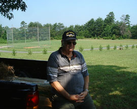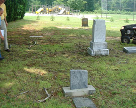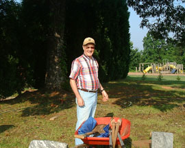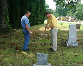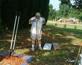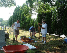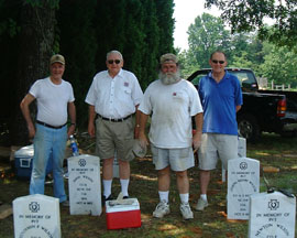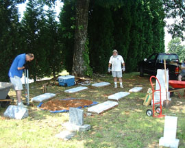 Rev. Dean Hart (Startown Bapt. Ch.) & Carl Jenkins (Jenkins Funeral Home) mark stone placement spots. Sticks mark the proposed stone placement in a beautifully shaded grove surrounded by other Wilson family members. 9:00 am. Derick Hartshorn wheels in the tools necesssary to dig the holes for the stones. Camp 849 Cdr., Ken Johnson begins the first of six holes. Joe Brown, Wilson Reunion Chairman, "directs" the operation. 11:am. Still digging. Carl Jenkins volunteers his labor. John Brinkley joins the crew. He becomes the tree root expert. 1:30 pm. Finally finished.