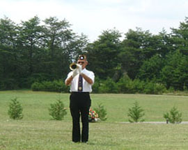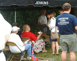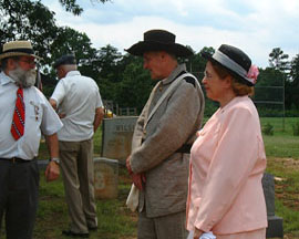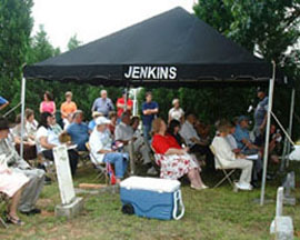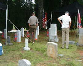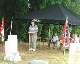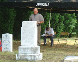 attendees witness the proceedings.Capt. C.F. Connor Camp 849 Cdr. Ken Johnson explains purposes of the event. Rev. Mike Jenkins and Cecil Thornburg observe the recently dedicated stones. John Brinkley and Penelope Bost Judd discuss ceremony with Camp Cdr. Ken Johnson Sylvia Kidd Ray greets President Mary Raye Casper, UDC president of the Syracuse, NY UDC Chapter. American Legion Post 16 Bugler plays the traditional "Taps." Rev. Dean Hart of Startown Baptist Church gives the benediction. Carl Jenkins, President of Jenkins Funeral Home, receives Certificate of Appreciation from Camp Commander Johnson. The history of the Startown Baptist Church reaches back to the early 1900's. During the 1990's, church attendance exceeded the physical limits of the facilities. It was proposed to build a new church which was eventually completed on Sigmon Dairy Road. The existing facilities were sold to the Jenkins Funeral Home who continued to do an excellent job of maintaining the buildings and grounds. President of Jenkins Funeral Home, Carl Jenkins, was instrumental in making this dedication ceremony a reality. In addition, he worked alongside of SCV members preparing the site for the stones. When he could have simply have given his blessing to our project, he gave up an entire day working with camp members. On the day of the ceremony, he supplied tents and chairs to make the ceremony an unqualified success. The Wilson family and the SCV owe Carl Jenkins and his family and business a sincere debt of gratitude.