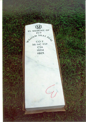 Long before serving for the Confederate States Army, William S. Deal was Church Secretary at St. John's Lutheran Church. In 1849, he was the synod representative to the "Evangelical Lutheran Tennessee Synod, Re-Organized." (At the time, St. Johns Church was well attended by Reformists from Alexander County). William Silas originally served his country as a camp guard in Mallat's Batallion and then as a private in Co. F, 38th Regiment, NC Troops. He was well known and respected in his community during his life-time. Nevertheless, until this project was completed, he was not remembered in either Catawba or Alexander county with any sort of permanent marker.