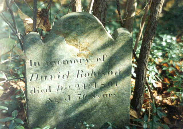The concern of slave owners for their charges appears to have been, for the most part, relatively benign. Catawba County history shows David Robinson as owner of a ninety-year old male slave. At the time (1850), David (1751-1801), son of James (1725-1786), was probably more of a companion to this 90-year old black man than an owner. Both of them were in the winter of their lives. Both are buried at this site. David's grave is marked. His companion's grave is not.
