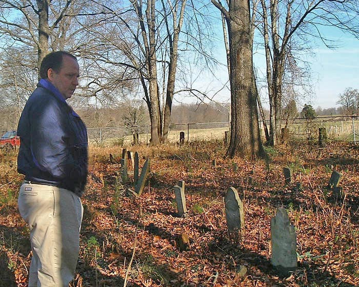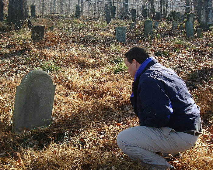 [John Cline examines the gravestone from another century.James Robinson, the Pioneer (1751/52-1786) lies here.