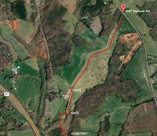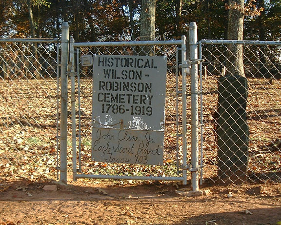 To get to the Wilson-Robinson cemetery, go south 1.6 miles past the intersection of Startown Road and Highway 10. A wooden stake propped against a brick column on the right denotes the address, "4687." The paved road turns into dirt. Park at the end and walk or else open a gate to the right and drive through the pasture, following the trail left by tires. Close all gates. One may find the cemetery under a grove of trees past the power lines. The land surrounding the cemetery belongs to Buddy Sherrill of Hickory.