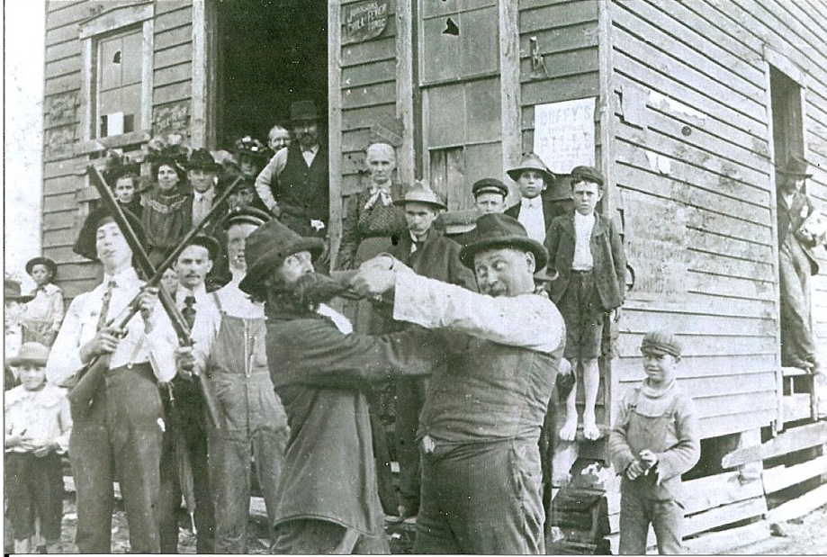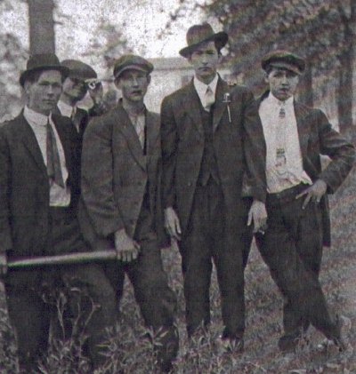 ![]() Mellon Watts, son of John Wesley Watts and Anzeline Fowler, is the tall man. The other men are unknown. |