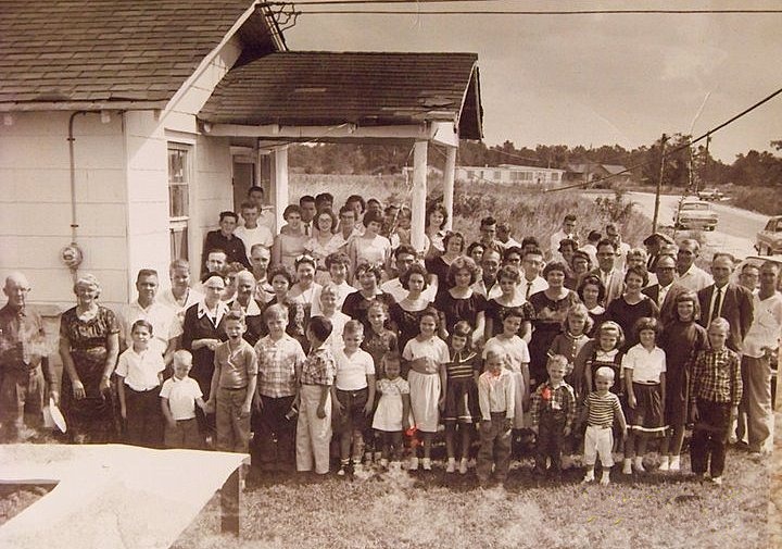 Photo contributed by Cathy Harrelson Alsup Members of "The Little Mission Church" at Prosper-Delco, North Carolina, about 1960. The building and land was owned and donated by Mr Caldwell and Elsie Hilburn Bordeaux. The members later built a larger church beside of this one which is today called Prosper Baptist Church. |