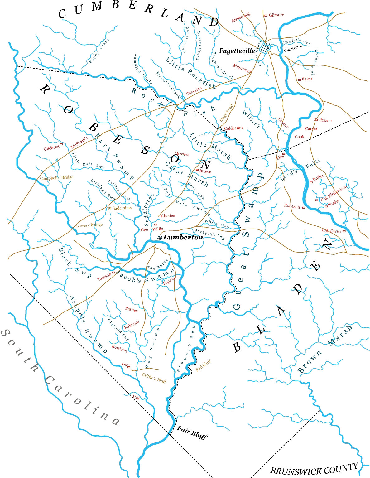 and redrew it in one of my graphics programs. It covers most all of Robeson, but covers lower Cumberland