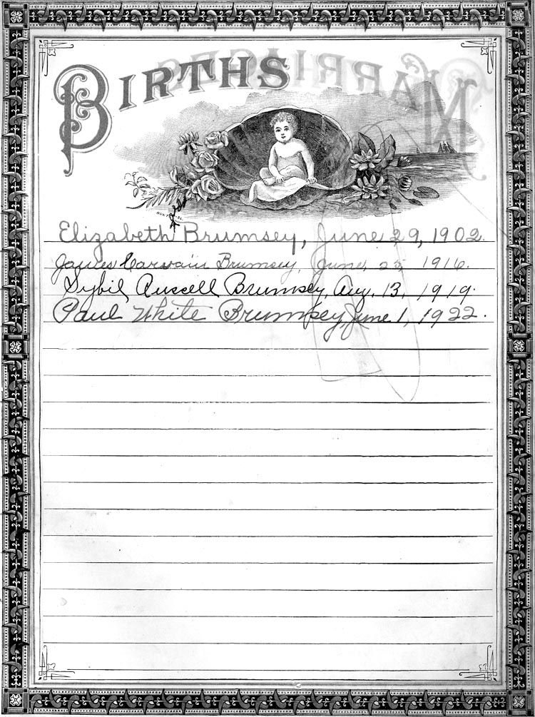 This Bible is part of the Paul White Brumsey Collection and kindly submitted by Elizabeth Vozzella, Esq., attorney for Paul W. Brumsey of Long Beach, California. No part of these records may be used for any commercial purposes. However, please feel free to copy any of this material for your own personal use and family research.