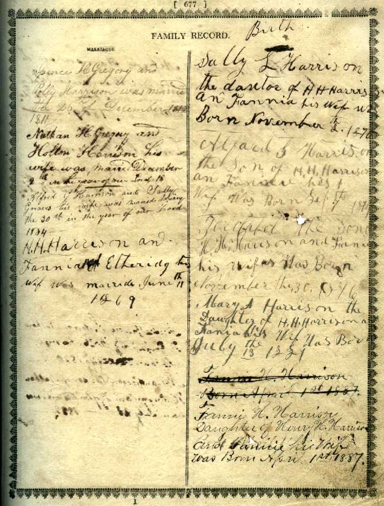 Polly Harrison was married the 26th of December Nathan H. Gregory and Hollon Harrison his wife was married December 2th in the year of our Lord 18 Alfred G. Harrison and Sally Greaves his wife was maried Janary the 30th in the year of our Lord 1834 H. H. Harrison an Fannia Etheridg his wif was marrid June 11th 1869 [The rest of this column is bleed-thru from page 678.] |