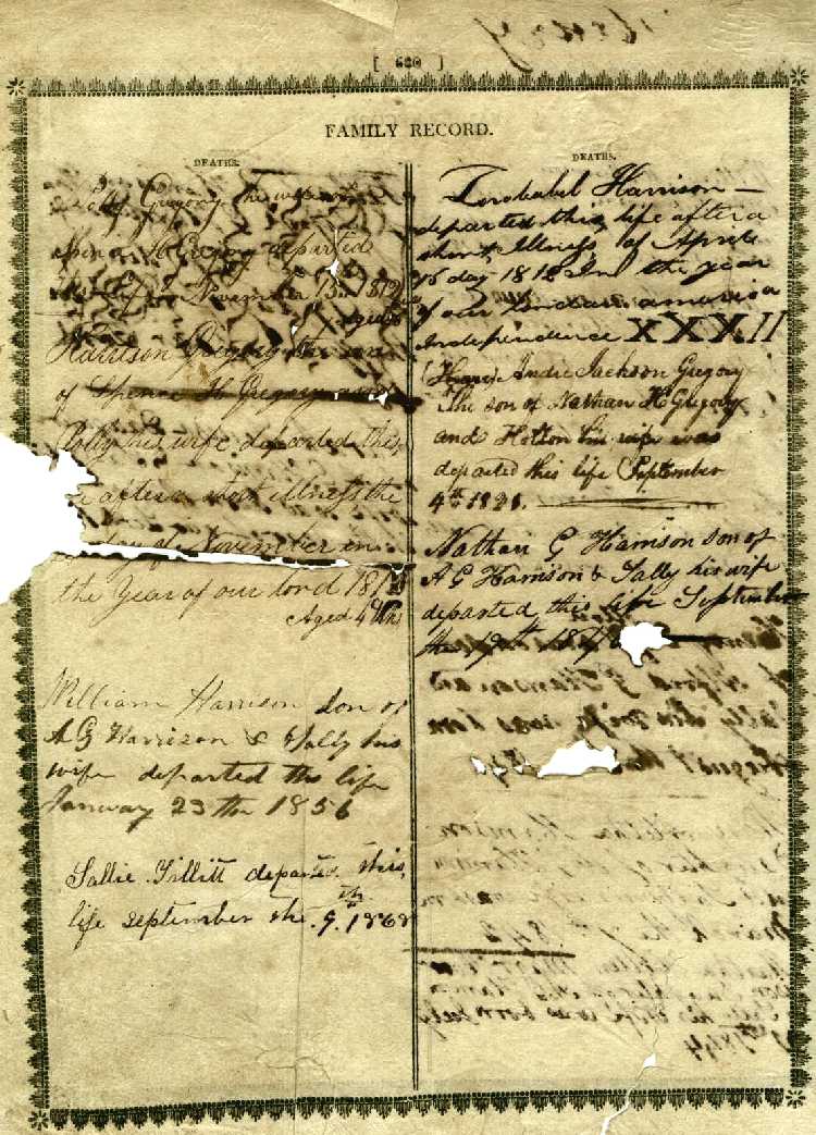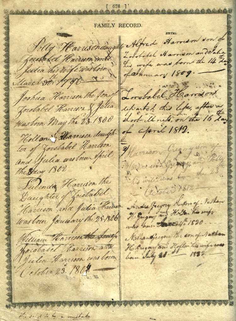 Births Alfred Harrison son of Zorobabel Harrison and Julia his wife was born the 14th day of January 1809. Zorobabel Harrison departed this life, after a short illness, on the 16th day of April 1812. [see his will here and Harrison Family Biography here] 2/ Harrison Gregory Son of Spence H. Gregory and Polly his wife was born the 28th of October 1812 Andre Gregory the Son of Nathan H. Gregory and Hollon his wife was born July 24th 1820 _ _ _ _ Nathan H. Gregory the son of Nathan H. Gregory and Hollon his wife was born July 21st 1822 |