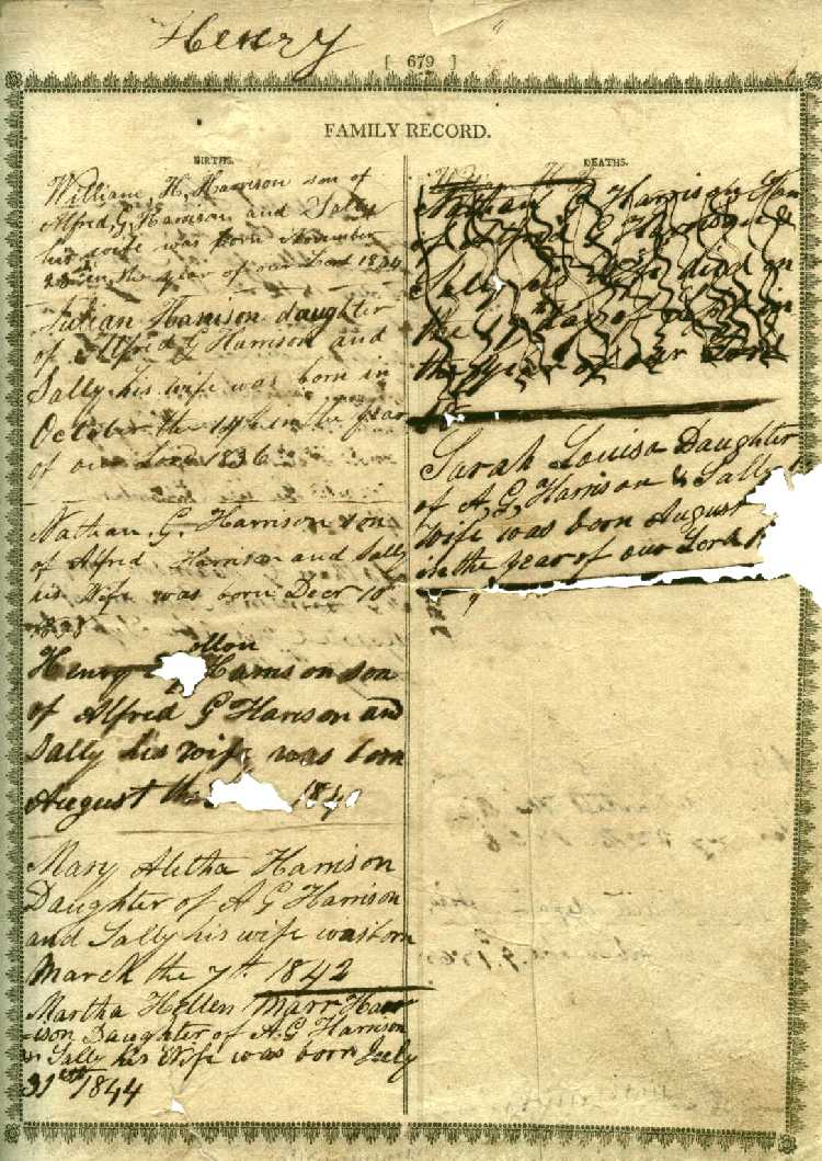 Births [the word Henry written at top of page] William H. Harrison son of Alfred G. Harrison and Sally his wife was born November 23rd in the year of our Lord 1834 Julian Harrison daughter of Alfred G. Harrison and Sally his wife was born in October the 14th in the year of our Lord 1836 Nathan G. Harrison son of Alfred Harrison and Sally his Wife was born Decr 10th 1838 Henry [H]ollon Harrison son of Alfred G. Harrison and Sally his wife was born August the [1st] 18[40] Mary Aletha Harrison Daughter of A. G. Harrison and Sally his wife was born March the 7th 1842 Martha Hellen Marr Harrison Daughter of A. G. Harrison & Sally his Wife was born July 31st 1844 |