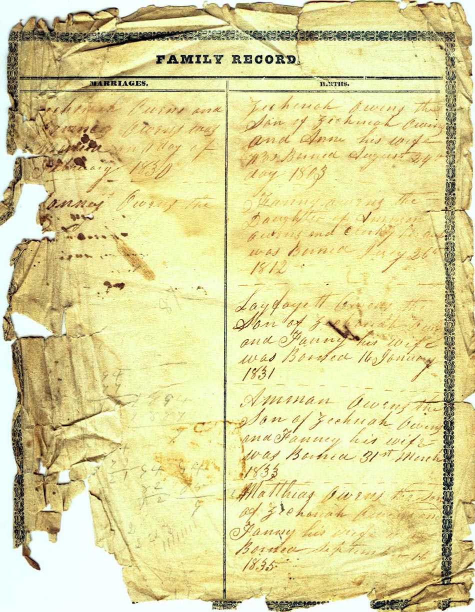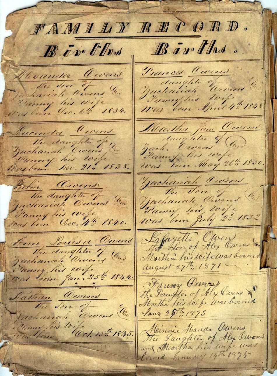 Births Zachariah Owens the Son of Zachariah Owens and Anna his wife was born Aug. 24th 1803 Fanny Owens the daughter of Ammon Owens & Clarky his wife was born July 26th 1812 Layfayett Owens the Son of Zachariah Owens and Fanny his wife was born Jany 16 1831 Ammon Owens the Son of Zachariah Owens and Fanny his wife was born March 31 1833 Mathias Owens the Son of Zachariah Owens and Fanny his wife was born Sept 16 18[35] |