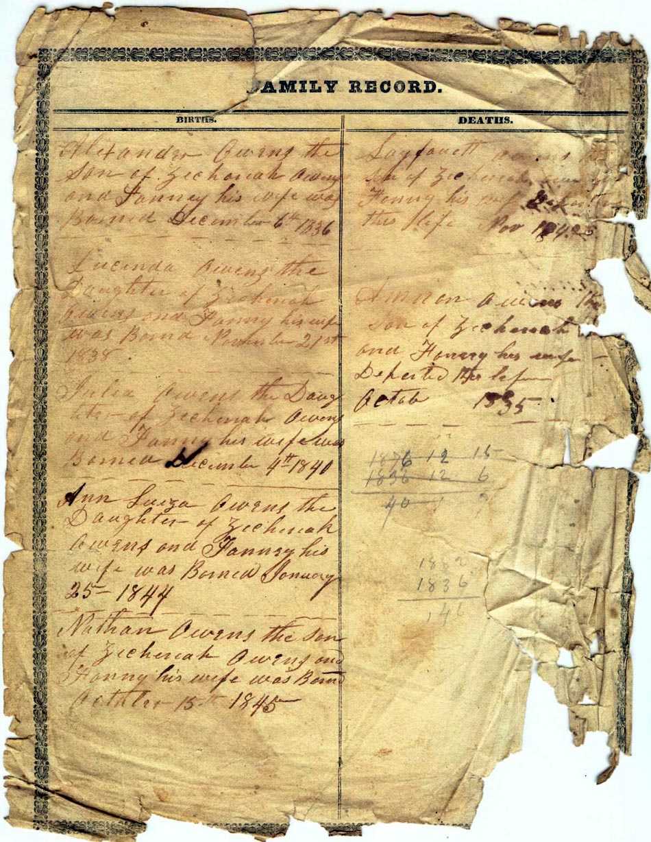 Births Alexander Owens the Son of Zachariah Owens and Fanny his wife was born Dec 6th 1836 Lucinda Owens the daughter of Zachariah Owens and Fanny his wife was born Nov 21 1838 Julia Owens the daughter of Zachariah Owens and Fanny his wife was born Dec 4th 1840 Ann Louisa Owens the daughter of Zachariah Owens and Fanny his wife was born Jan 25th 1844 Nathan Owens the Son of Zachariah Owens and Fanny his wife was born Oct 15th 1845 |