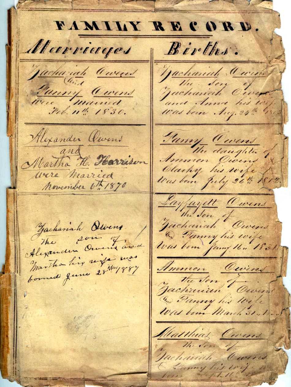 Marriages Zachariah Owens and Fanny Owens were married Feb. 11th 1830. Alexander Owens and Martha H. Harrison were married November 6th 1870 Zachariah Owens the son of Alexander Owens and Martha his wife was borned June 28th 1887 |