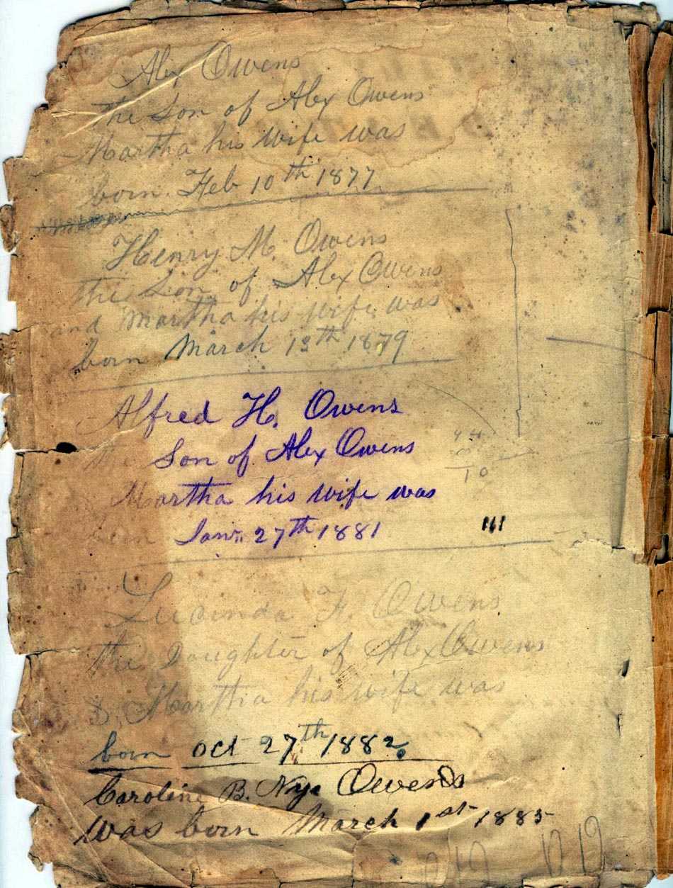 Zachariah Owens, III married his cousin, Frances "Fanny" Owens and they had a son named Alexander Owens who married Martha Helen Marr Harrison. We can only surmise that this is possibly how these loose pages came to be in the Zorobabel Harrison Bible.