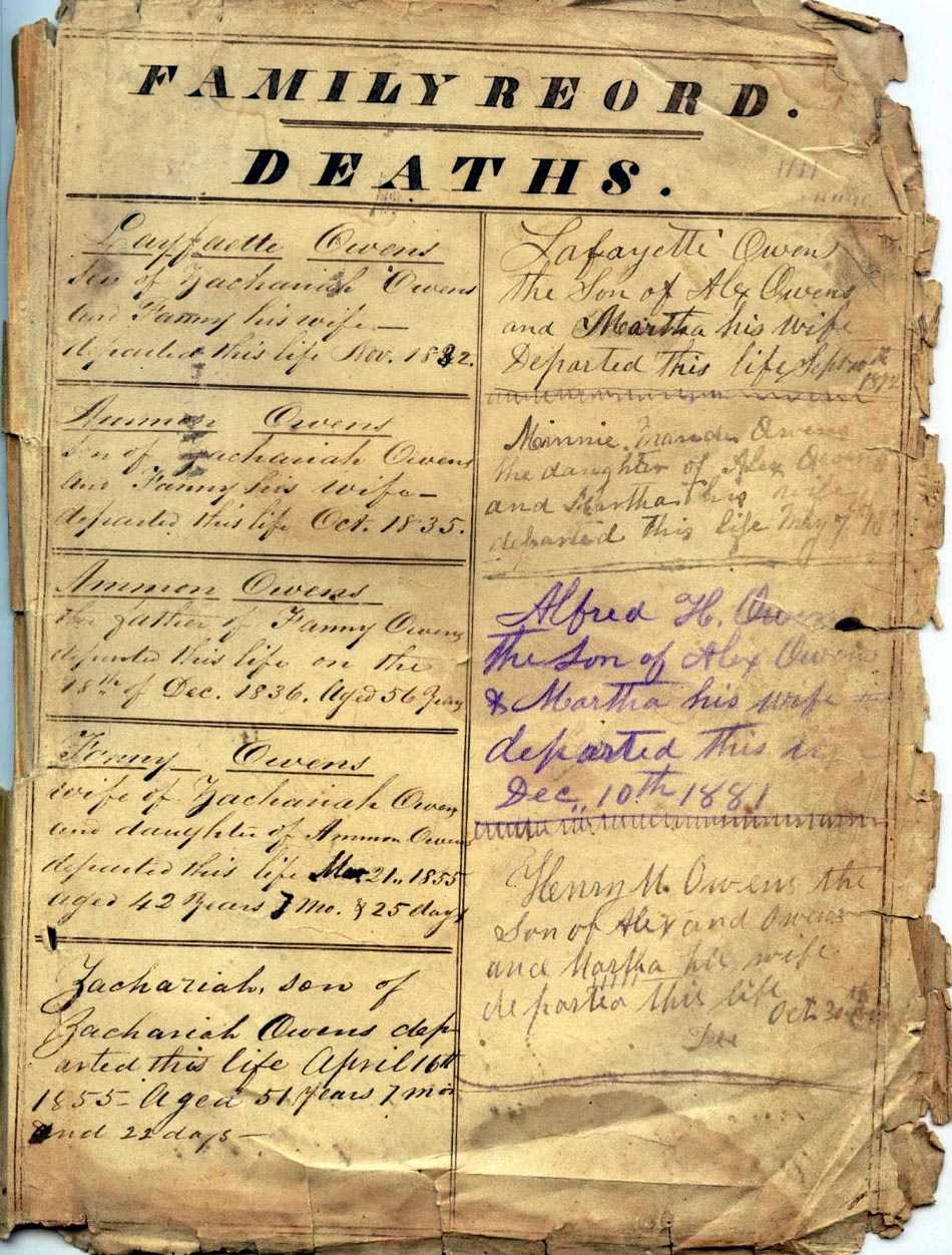 Deaths Layfaette Owens Son of Zachariah Owens and Fanny his wife departed this life Nov 1832 Ammon Owens son of Zachariah Owens and Fanny his wife departed this life Oct 1835 Ammon Owens the father of Fanny Owens departed this life on the 18th of Dec 1836. Aged 56 years Fanny Owens wife of Zachariah Owens and daughter of Ammon Owens departed this life Mar 21 1855 aged 42 years 7 Mo & 25 days Zachariah, son of Zachariah Owens departed this life April 16th 1855 - Aged 51 years 7 Mo. and 22 days |