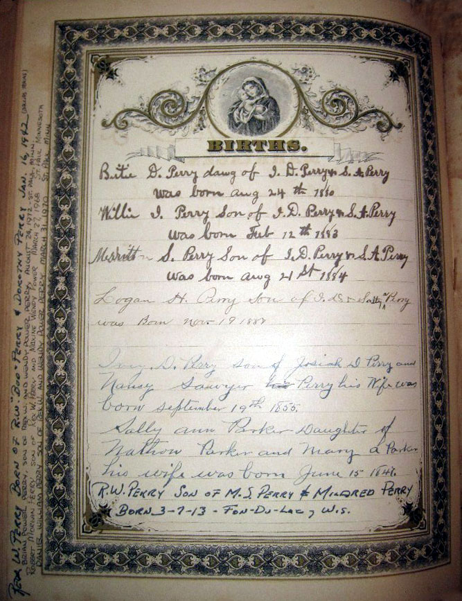 Sawyer Sally Ann Parker Daughter of Nathan Parker and Mary A. Parker his wife was born June 15, 1847. R.W. Perry Son of M.S. Perry & Mildred Perry Born 3-7-13 - Fon-Du-Lac, Wis.