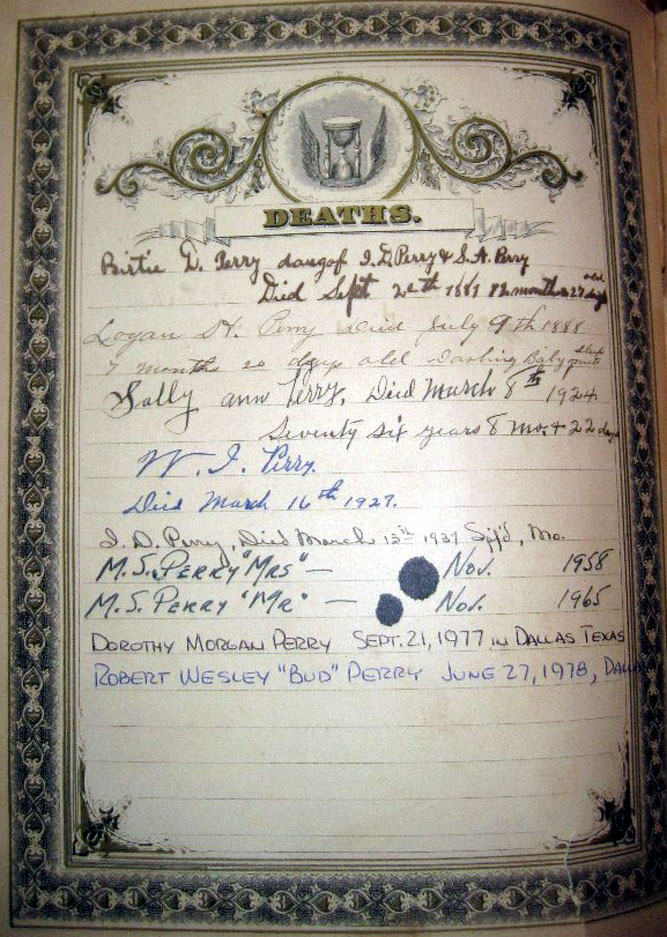 old Sally Ann Perry, Died March 8th 1924 - Seventy six years 8 mos. & 22 days [see Find-A-Grave] W.I. Perry Died March 16th 1927. I.D. Perry, Died March 13th 1937 Spf'd, Mo. [see Find-Grave] M.S. Perry "Mrs" - Nov. [29] 1958 [see Find-A-Grave] M.S. Perry "Mr." - Nov. [22] 1965 [see Find-A-Grave] Dorothy Morgan Perry - Sept. 21, 1977 in Dallas, Texas [see Find-A-Grave] Robert Wesley "Bud" Perry - June 27, 1978, Dallas [see Find-A-Grave] |