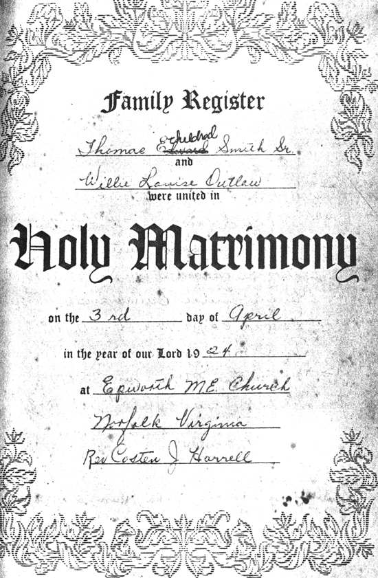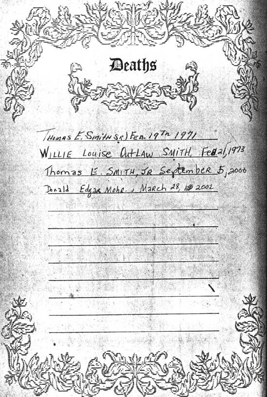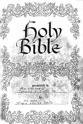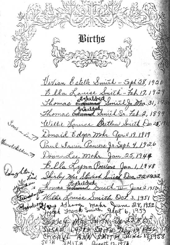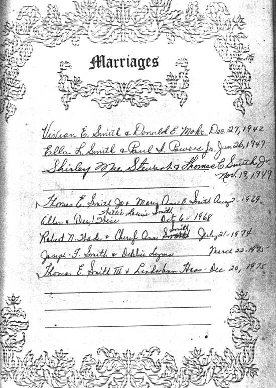 (Note: in 2001 Mrs. Mary Ann Bateman Smith, owner of the Bible and 2nd wife of Thomas E. Smith, Jr. made changes in this Bible. In the Joseph F. Smith Bible, Thomas is listed as Thomas "Etheldred" Smith, however, his son, Thomas Jr. had Edward for a middle name and his marriage certificate reflects that.)