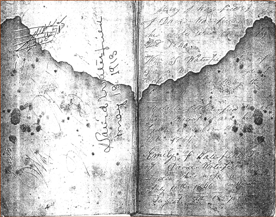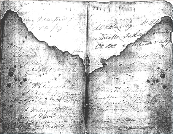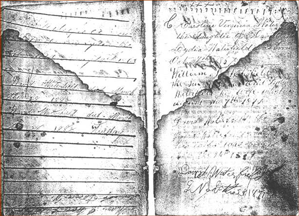 This Bible suffered extensive water damage at some point in time. Of the 5 pages some could be read fairly easily, and some could not. I hope the Bible transcriptions below each page will be valuable to Waterfield researchers. Anyone knowing more about this family please e-mail me.