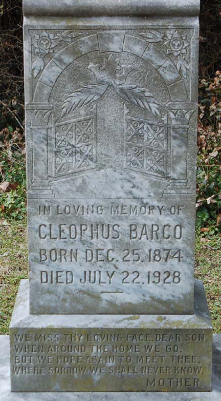 | Barco, Cleophus | Dec. 25, 1874 | July 22, 1928 | In loving memory of - We miss thy loving face dear son, when around the home we go, but we hope again to meet thee, where sorrow we shall never know. /s/ Mother |