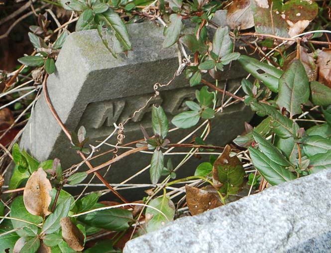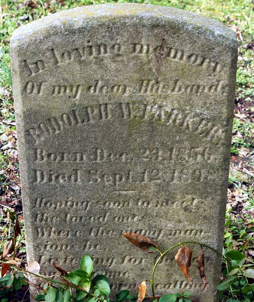 | Parker, Rodolph W. | Dec. 23, 1856 | Sept. 12, 1898 | In loving memory of my dear husband - Hoping soon to meet the loved one, Where the many mansions be, Listening for [remainder is covered with vines] |