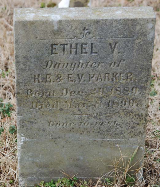 | Parker, Ethel V. | Dec. 29, 1889 | Mar. 8, 1890 | Daughter of H.R. & E.V. Parker - Gone to rest |