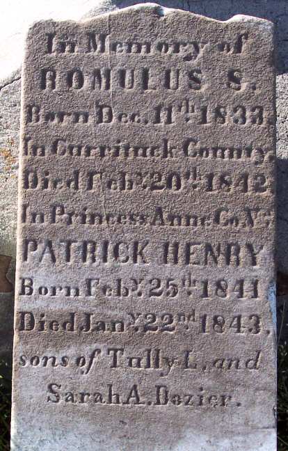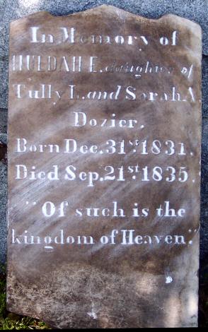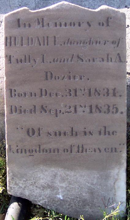 | Dozier, Huldah E. | Dec. 31st 1831 | Sep. 21st 1835 | daughter of Tully D. & Sarah A. Dozier [Photo - 2] |